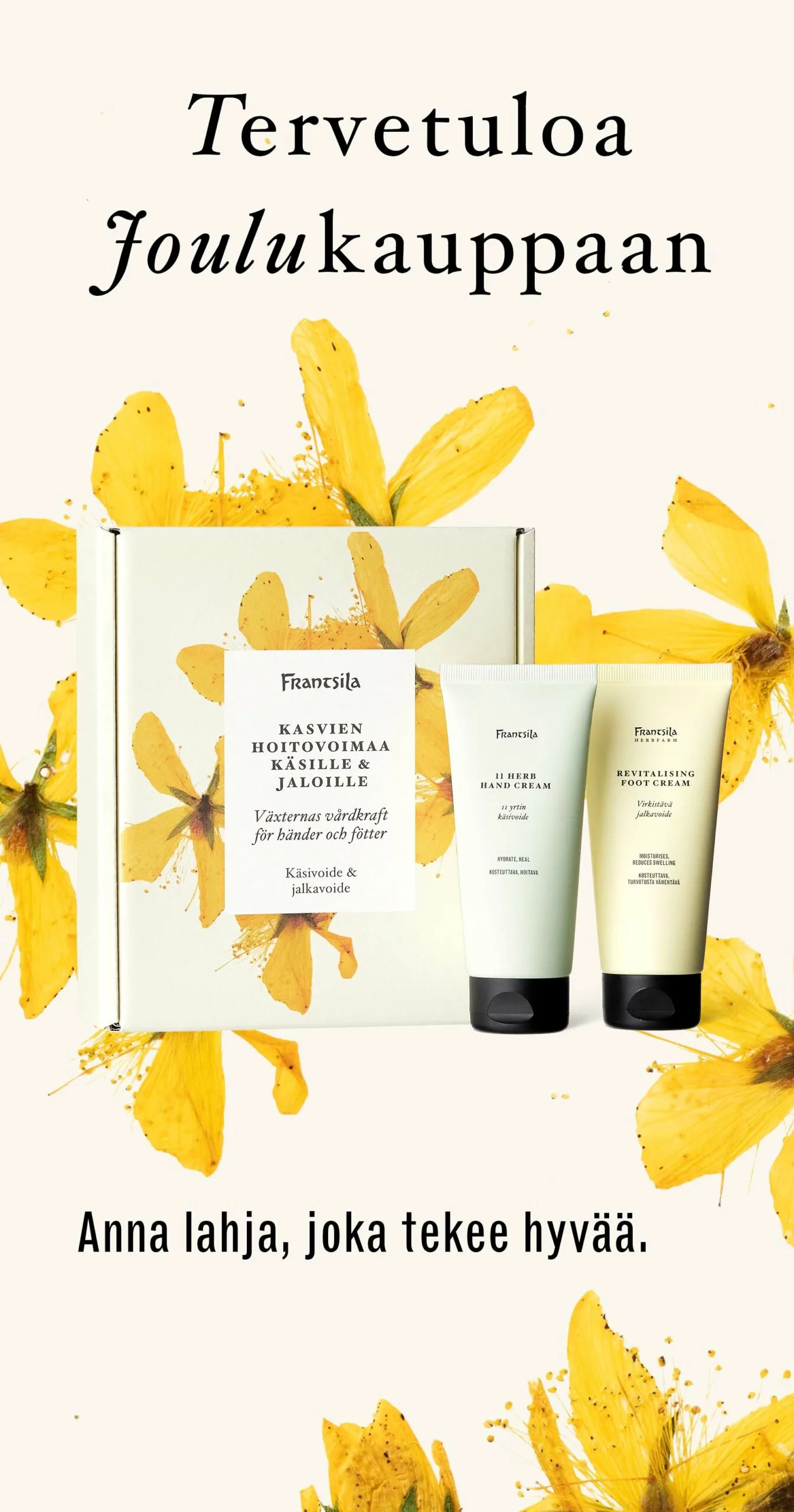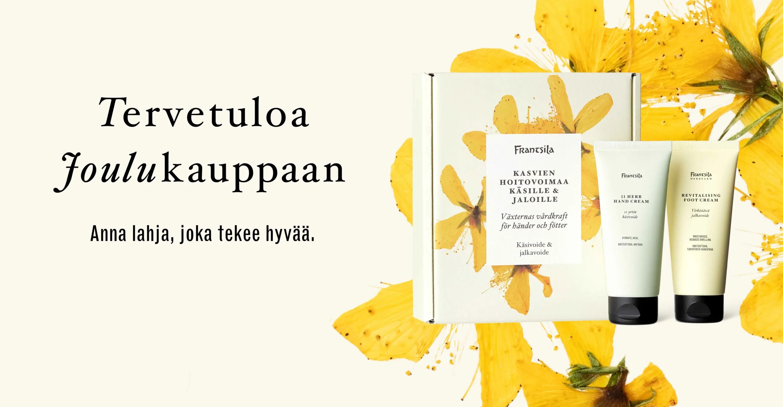 Joulun hoitavimmat lahjat tulevat Frantsilan valmiissa lahjapakkauksissa, mukana tutut bestsellerit ja tämän joulun hyvää tekevät uutuudet. Lahjoitamme verkkokauppamme koko loppuvuoden myynnistä 3% Baltic Sea Action Groupille Itämeren suojelutyöhön.
