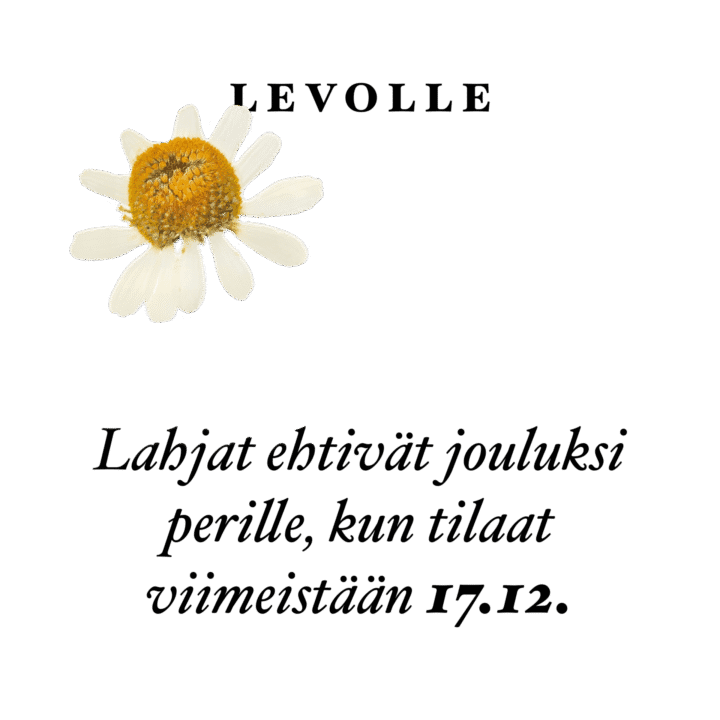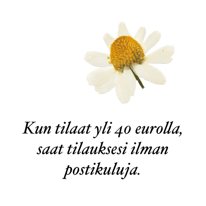 Kun tilaat yli 40 eurolla, toimitamme tilauksesi ilman postikuluja. Lahjat ehtivät jouluksi perille, kun tilaat viimeistään 17.12.