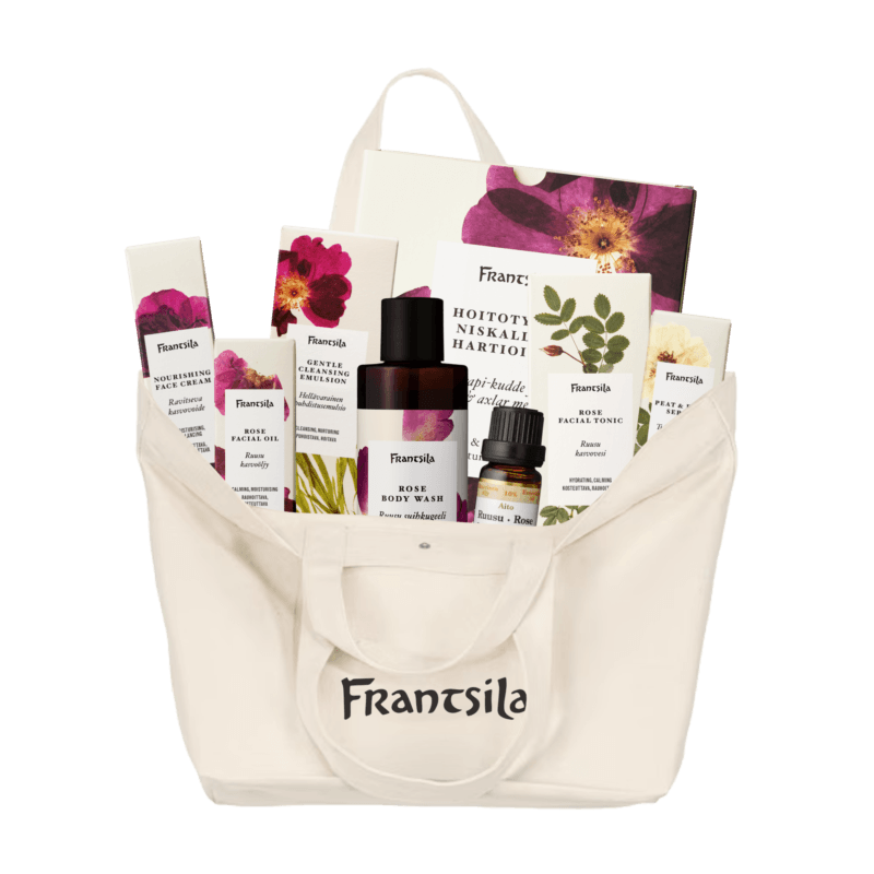 Frantsilan ruusukassi kokoaa yhteen 8 ruusuista suosikkia kasvoille ja vartalolle. Kassi tuo yhteen ruususarjan ajattomia klassikoita, joissa ruusun hoitovoima ja huolella valitut tehoaineet ovat keskiössä. Ruusu sopii erityisesti kuivalle, herkälle ja reaktiiviselle iholle sekä iholle, joka kaipaa tasapainoa ja suojaa.