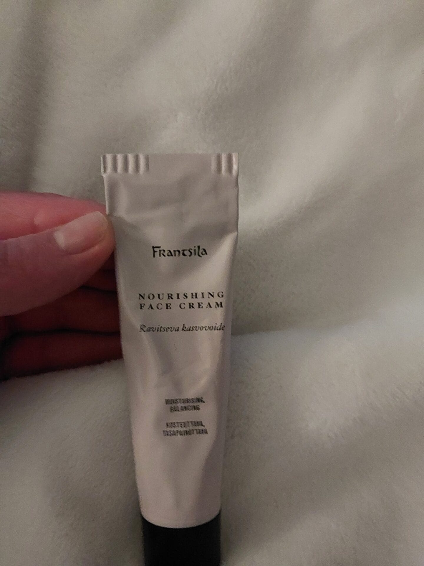 Koostumus ja tuoksu miellyttävä, iho tuntuu koko vuorokauden pehmeältä (käytän yö- ja päivävoiteena). Kaikista tuotteista ja lähetyksestä yhteisesti: Postipakkauksen koko oli näille tuotteille ylimitoitettu – vaikka kulut pienemmästä laatikosta olisi teille samat, kuluttajalle iso pakkaus on noudettaessa hankala, turhauttaa myös ympäristöä ajatellen. On myös ikävää heittää kauniit tuotepakkauksenne roskiin. Etiketissä ja tuubissa olevat tuotetekstit ovat aivan liian pienet lukea, tilaa olisi kasvattaa ne isommaksi ilman että ulkoasu kärsii (minifontti taitaa olla suunnittelijanne maneeri?). Miksi kasvovoide on pakattu näin pieneen tuubiin – min 50 ml olisi käyttäjälle viisaampi. Olen tähän mennessä käyttänyt Essen ja Aesopin vastaavia tuotteita. Hintanne ovat mainiot, mutta pakkauskokoa voisi vielä harkita. Muuten taisitte saada minusta uskollisen, uuden asiakkaan:)